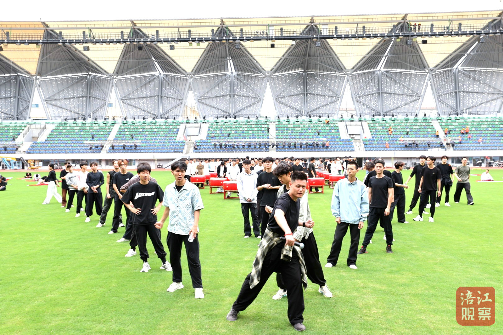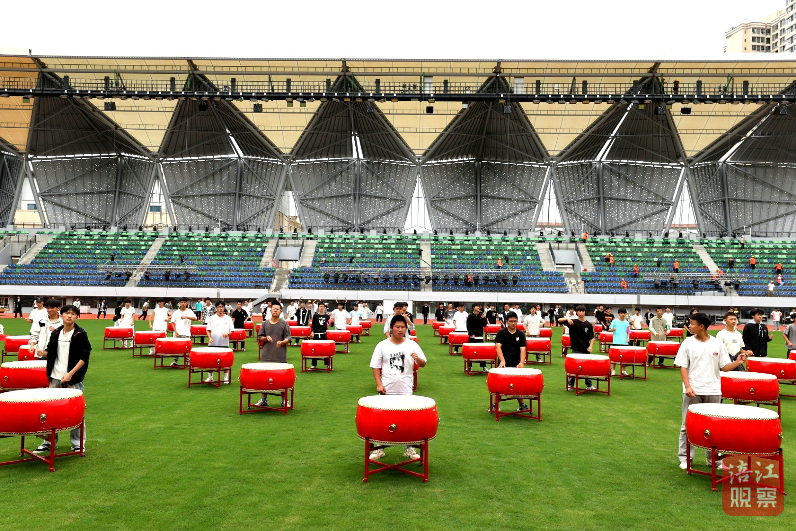 走進三臺體育場,嶄新的場館映入眼簾,場內一片熱火朝天的景象:一邊是數百名演職人員緊張排練,另一邊則是由鼓手旗手表演方隊編導兼領舞陳天賜帶領的隊伍,他們正進行著最后的合練。
