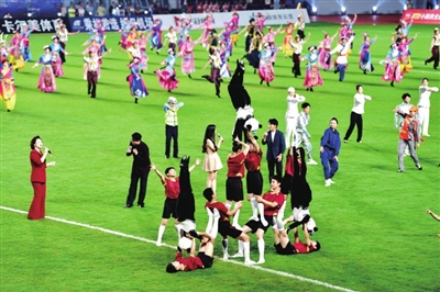 中場休息時,綿陽與德陽兩地歌手聯(lián)袂帶來歌曲《超越夢想》,四川籍實力唱將黃英領(lǐng)唱《我和我的祖國》,球迷紛紛加入合唱。