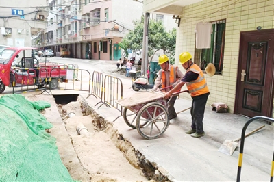 游仙區老舊小區居民自建房小區消防設施改造項目現場,工人正在進行管道的鋪設與填埋工作。