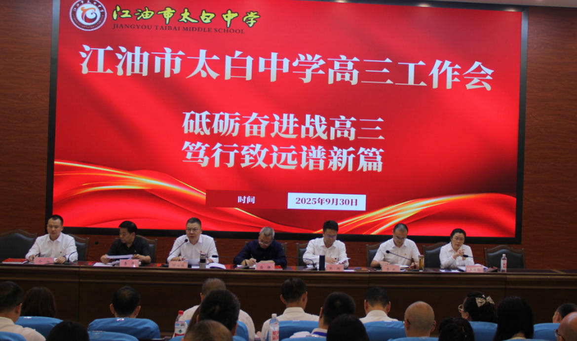 綿陽新聞網訊 9月30日下午,江油市太白中學在立德樓學術廳召開了以“砥礪奮進戰高三 篤行致遠譜新篇”為主題的2023級高三工作會。中共江油市委教育工委委員、教體局黨組成員、副局長盛雄,江油市教體局教育一股股長李澤,該校行政及高三全體教師參加會議。會議由該校黨委副書記、校長何必強主持。會議在激昂的國歌聲中拉開序幕……