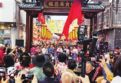 長假首日,該縣新打造的報(bào)恩美食坊文化街區(qū)盛大開街。紅綢高懸的牌坊下,白馬姑娘盛裝歌舞迎賓;青石板路上,“貨郎NPC”派發(fā)仿古銀票,六大主題打卡點(diǎn)人流如織。時(shí)值“川超”賽事,街區(qū)巧妙設(shè)置“第二觀賽點(diǎn)”,通過賽事直播、消費(fèi)券發(fā)放、有獎(jiǎng)競猜等環(huán)節(jié),將賽場激情與市井煙火氣完美融合。