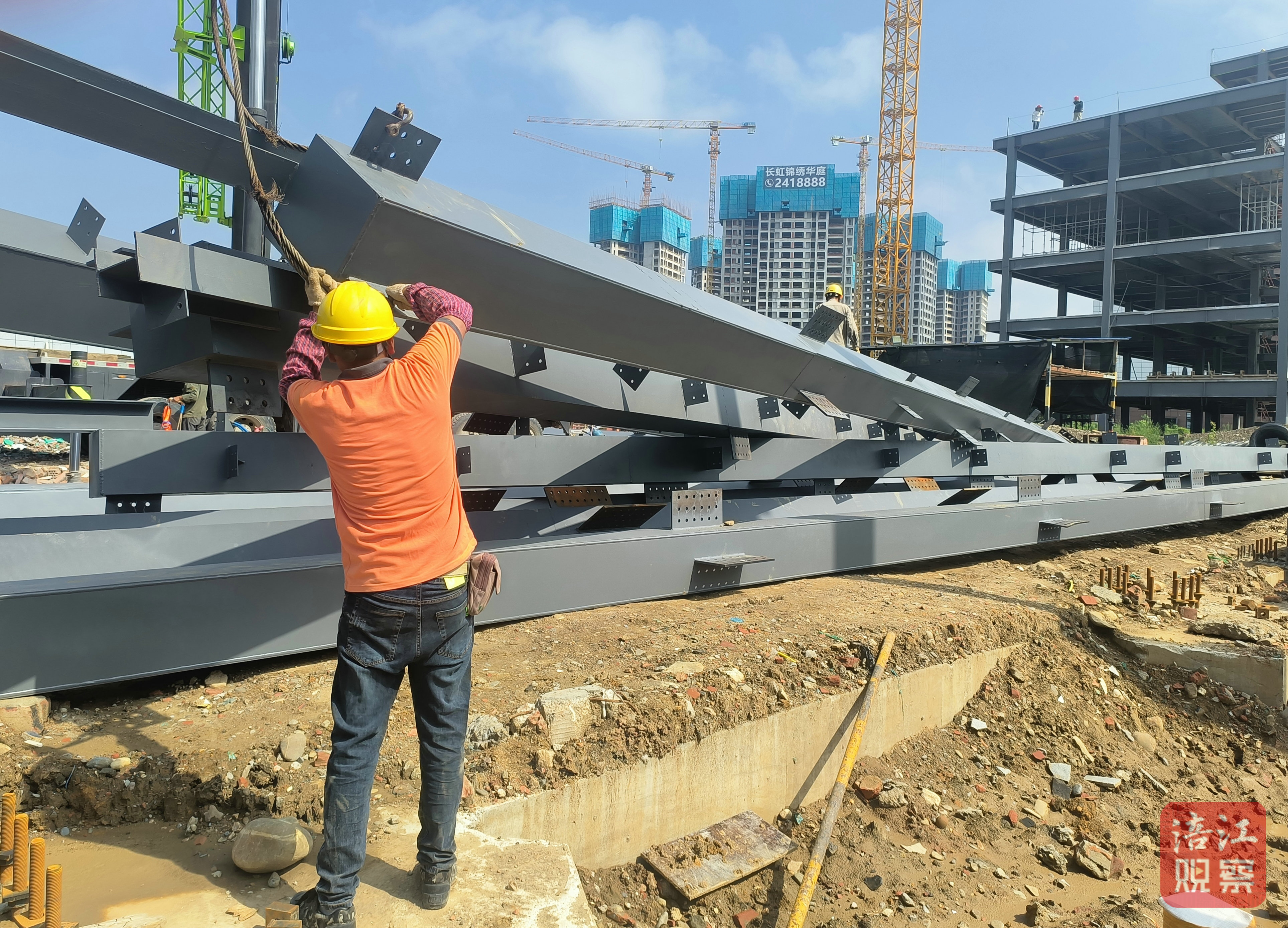 “目前,我們正在進行鋼構的安裝,鋼柱和鋼梁的安裝都在同步推進,鋼梁部分已經施工到三四層了。”施工現場負責人廖鋒指著正在“生長”的廠房向記者介紹,“右邊的綜合辦公樓主體樓板已經完成,二樓以上準備砌磚,底樓即將打墊層,我們正全力沖刺,確保今年12月底能夠如期完工。”