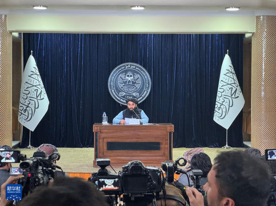 10月12日,阿富汗政府發(fā)言人扎比烏拉·穆賈希德在首都喀布爾舉行的記者會上發(fā)言。
