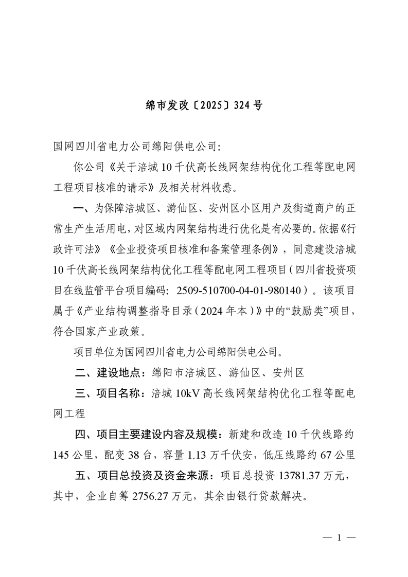 綿陽市發(fā)展和改革委員會關(guān)于涪城10千伏高長線網(wǎng)架結(jié)構(gòu)優(yōu)化工程等配電網(wǎng)工程項目核準的批復(fù)