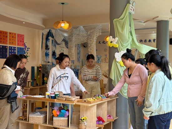 在黨支部副書記薛梅的帶領下,行政團隊與全體教師深入各班,對扎染、面塑、造紙等八大非遺區(qū)角進行現(xiàn)場觀摩與研討。