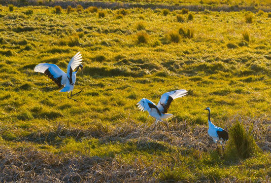 10月9日,在黑龍江撓力河國家級自然保護區,丹頂鶴在濕地中活動(無人機照片)。