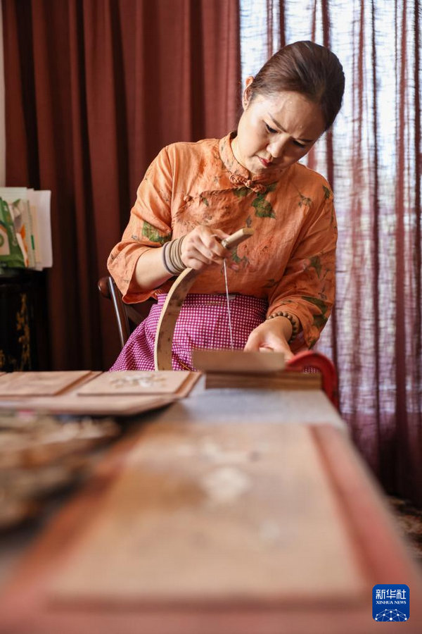 10月15日,胡蓉在孔浦街道怡江社區的非遺工作室內展示骨木鑲嵌技藝。