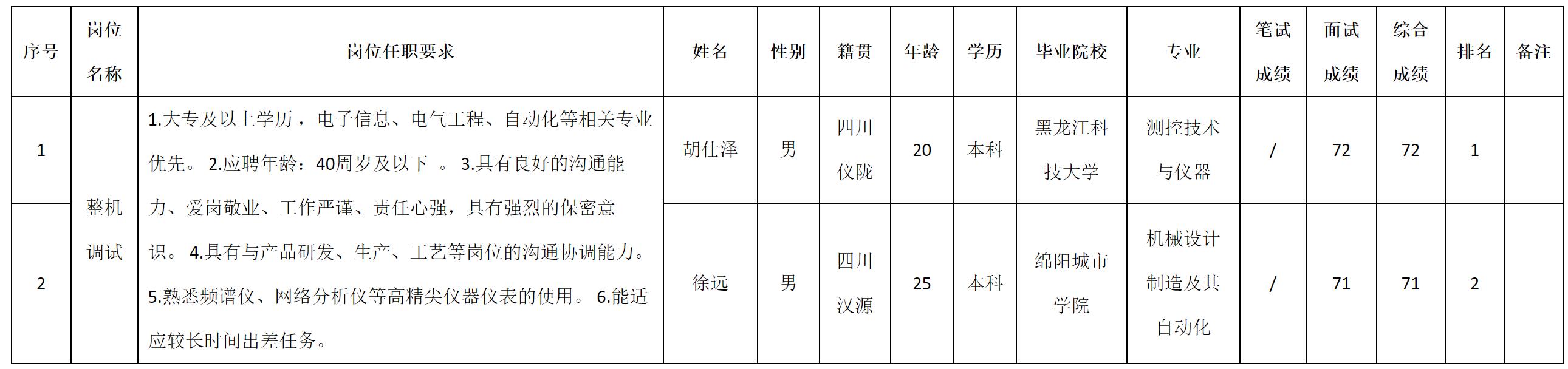 四川九洲防控科技有限責任公司關于招聘整機調試測試成績的公示