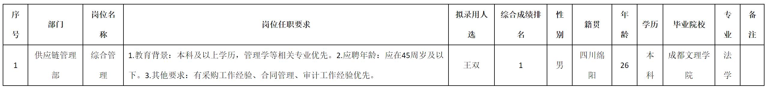 根據(jù)四川九州電子科技股份有限公司發(fā)布的招聘公告及招聘相關規(guī)定,經(jīng)測試、考察、體檢等程序,擬錄用王雙同志到四川九州電子科技股份有限公司工作,現(xiàn)予以公示,具體情況如下: