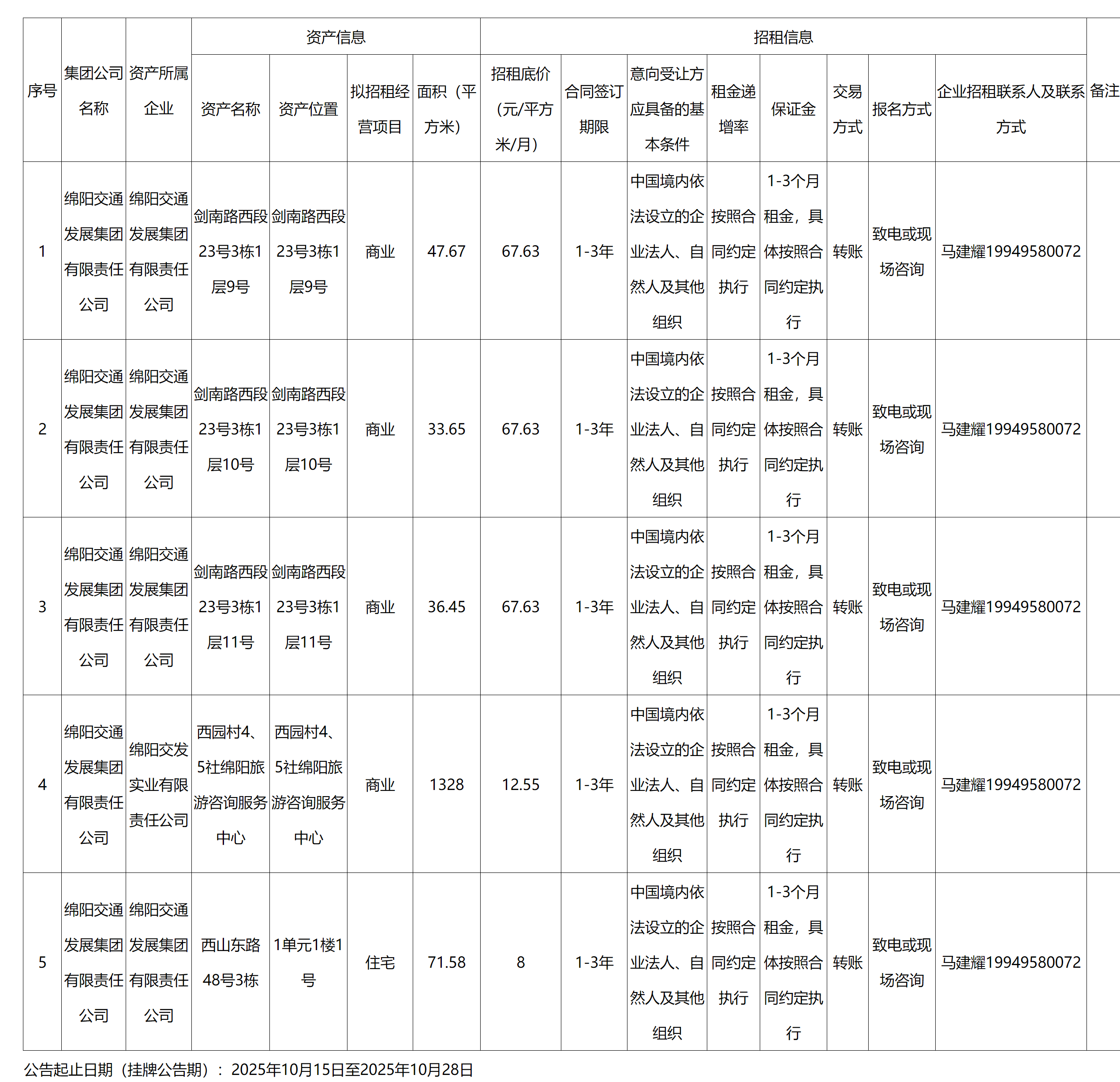 綿陽交發實業有限責任公司市區內部分資產招租公告