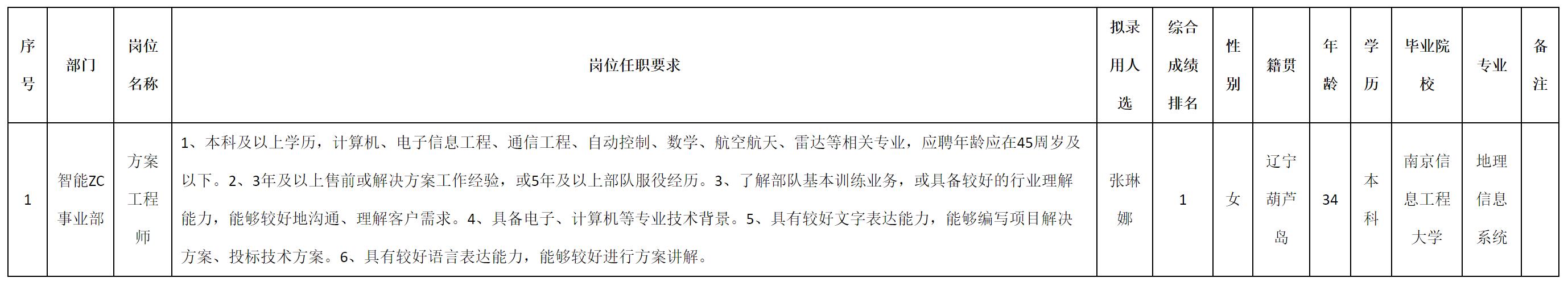 根據四川九洲投資控股集團有限公司軟件與數據智能軍團發布的招聘公告及招聘相關規定,經測試、考察、體檢等程序,擬錄用張琳娜同志到四川九洲投資控股集團有限公司軟件與數據智能軍團工作,現予以公示,具體情況如下: