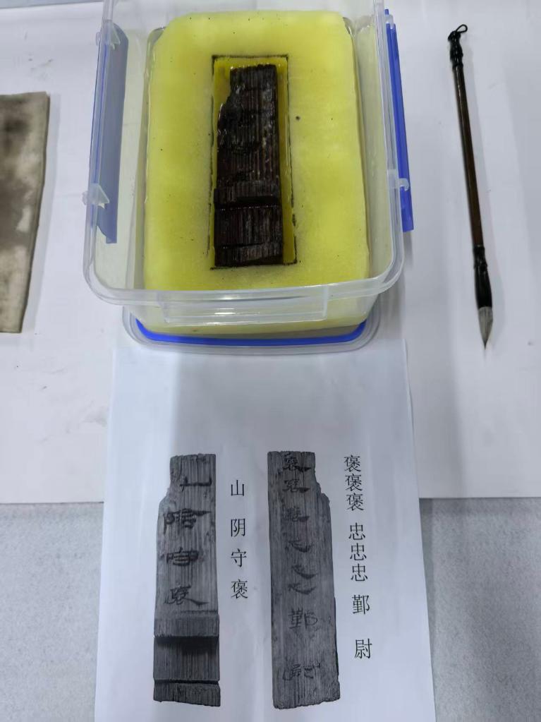 記者看到,有一件文書檢已經識讀出來,兩面均是清晰的漢隸字體,正面墨書“山陰守褒”,反面墨書“褒褒褒 忠忠忠 鄞尉”。李龍彬告訴記者,這應是當時官員練習書寫的文書檢。習字內容可能與會稽太守對鄞縣縣尉的嘉獎有關。(記者馮源)