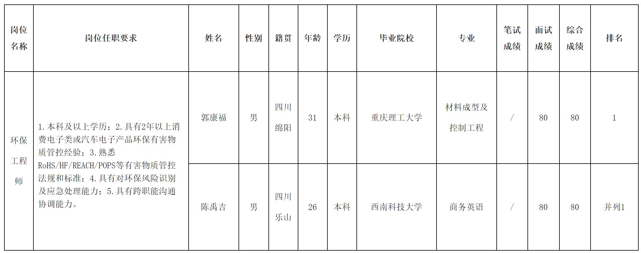 根據四川華豐科技股份有限公司發布的招聘公告及招聘相關規定,經筆試、面試等程序,現將測試成績予以公示。
