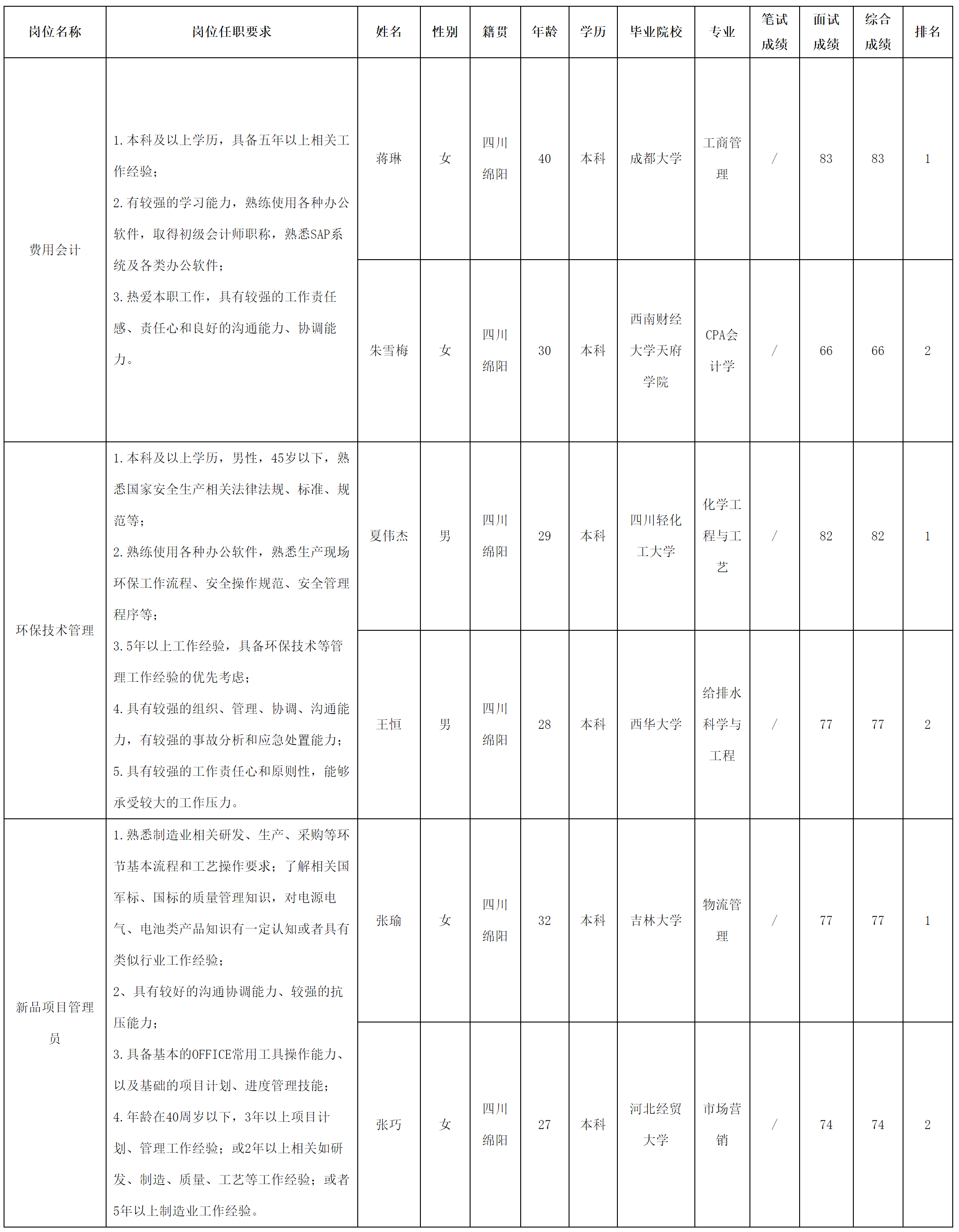 根據(jù)長虹電源公司發(fā)布的招聘公告及招聘相關規(guī)定,現(xiàn)將測試成績予以公示。