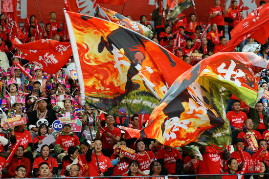 19時(shí)30分,在一片歡呼聲中,身著白色戰(zhàn)袍的廣元?jiǎng)﹂T(mén)雄關(guān)隊(duì)、身披紅色戰(zhàn)衣的綿陽(yáng)九洲長(zhǎng)虹隊(duì)球員陸續(xù)亮相。