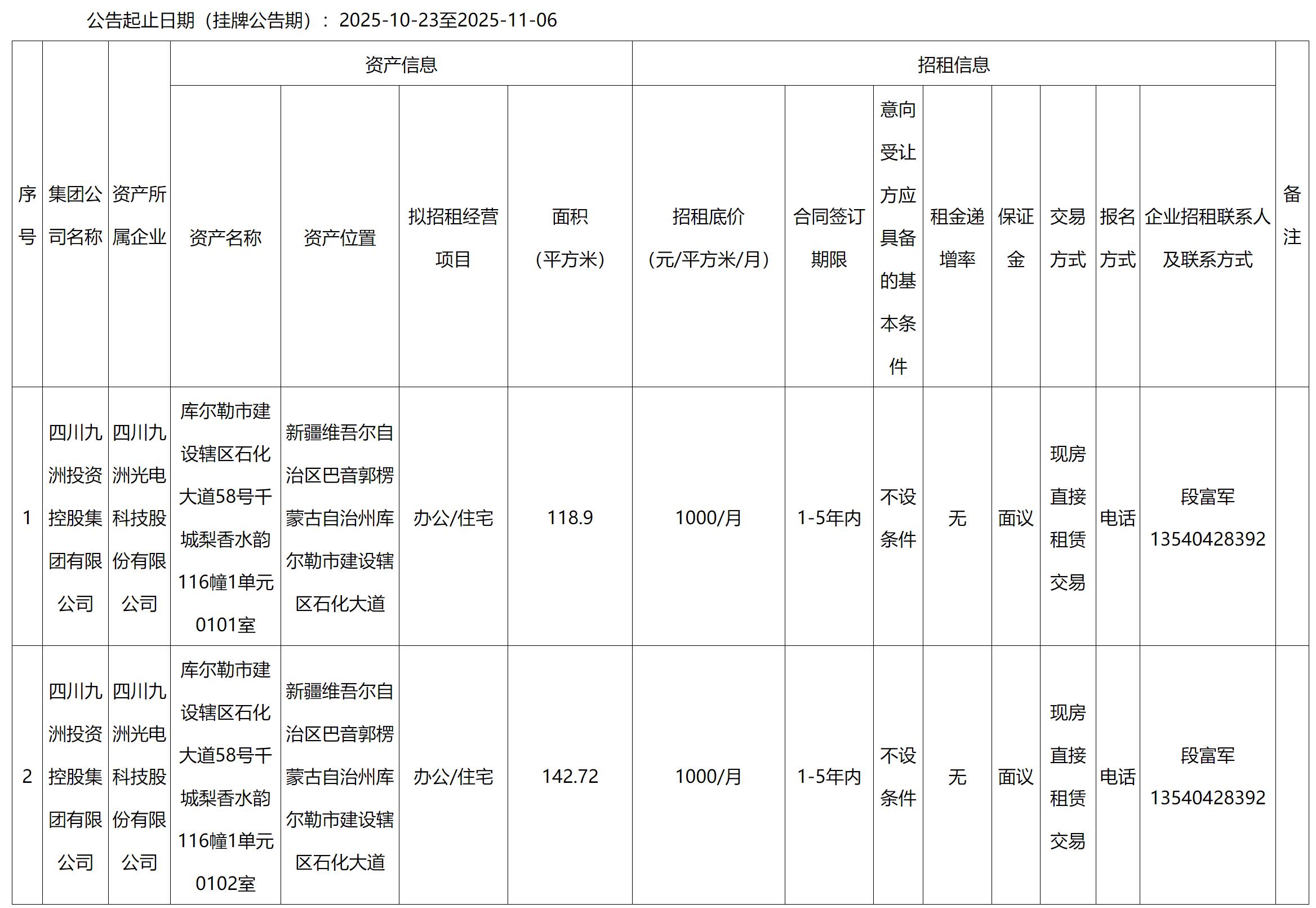 四川九洲光電科技股份有限公司資產(chǎn)出租公告