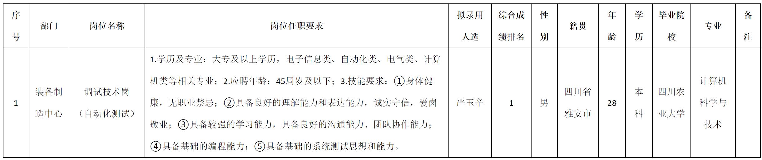根據四川九洲電器集團有限責任公司發布的招聘公告及招聘相關規定,經測試、考察、體檢等程序,擬錄用嚴玉辛同志到四川九洲電器集團有限責任公司工作,現予以公示,具體情況如下: