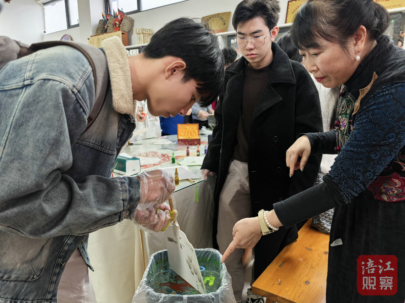 在漆扇體驗區(qū),漆扇體驗區(qū)非遺老師蔣麗春耐心為留學(xué)生們講述傳統(tǒng)漆扇制作技法,空白扇面上,留學(xué)生們盡情揮灑色彩創(chuàng)意,水的靈動與漆色的鮮亮碰撞出獨(dú)特的“扇面”。老撾留學(xué)生米粒看著畫面,驚奇地睜大了雙眼:“這太奇妙了,就像雨后的彩虹。”