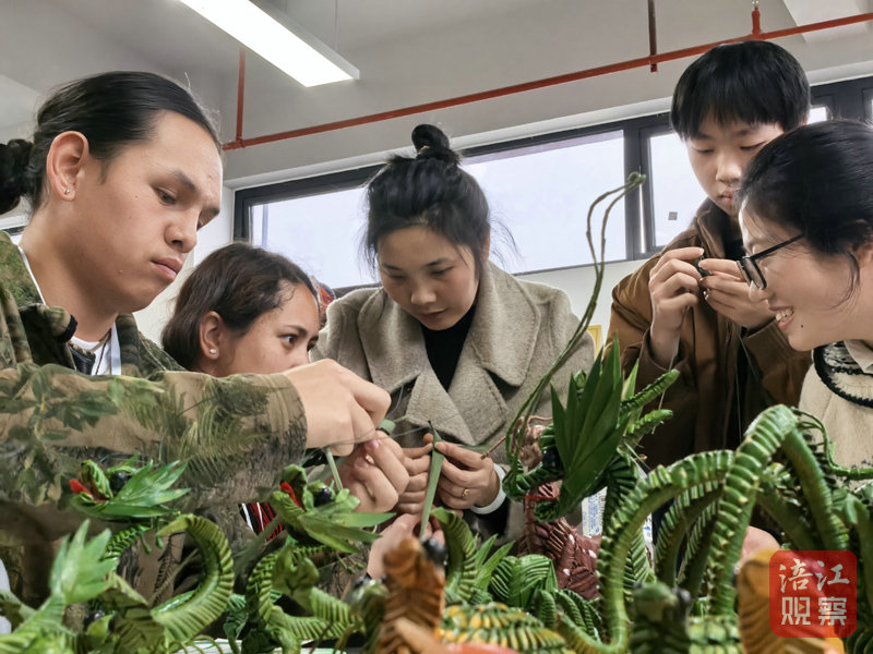 在草編區(qū),非遺傳承人黎覓現(xiàn)場展示技藝,一根根普通草絲在指尖纏繞、打結(jié),秒變惟妙惟肖小動物,留學(xué)生們爭相討教,學(xué)得有模有樣。