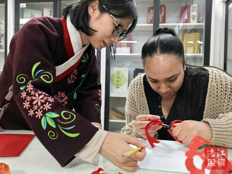 剪紙區里,非遺老師手握剪刀,寥寥數下便將一張彩紙變成靈動月餅形狀的窗花,留學生們在老師的教授下,指尖雖略顯生疏,但最終剪出了想要的圖案。新西蘭留學生特-拉哈納·佩塔·羅皮哈拿著自己的作品歡呼,興奮地向其他留學生“炫耀”。他興奮地說:“太神奇了!像魔術一樣!”