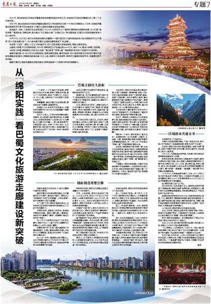 今天(10月30日),《重慶日報》刊發文章《從“綿陽實踐”看巴蜀文化旅游走廊建設新突破》,報道了在成渝地區雙城經濟圈建設邁入第二個五年新征程的關鍵時期,綿陽作為巴蜀文化旅游走廊建設的重要節點,如何通過深挖文化底蘊、推動創新創造、加強區域聯動,為走廊建設注入新動能、提供新樣本。報道如下: