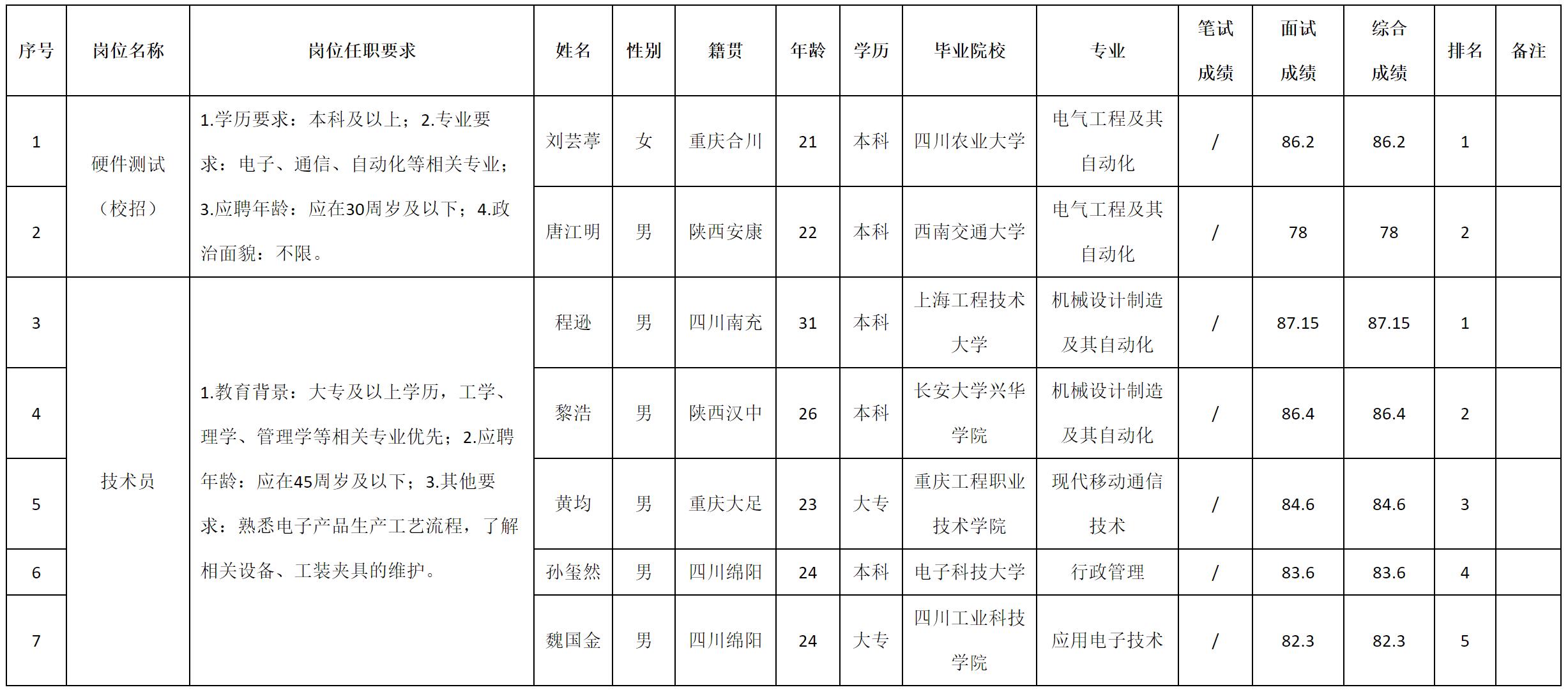 根據四川九州電子科技股份有限公司發布的招聘公告及招聘相關規定,現將測試成績予以公示。