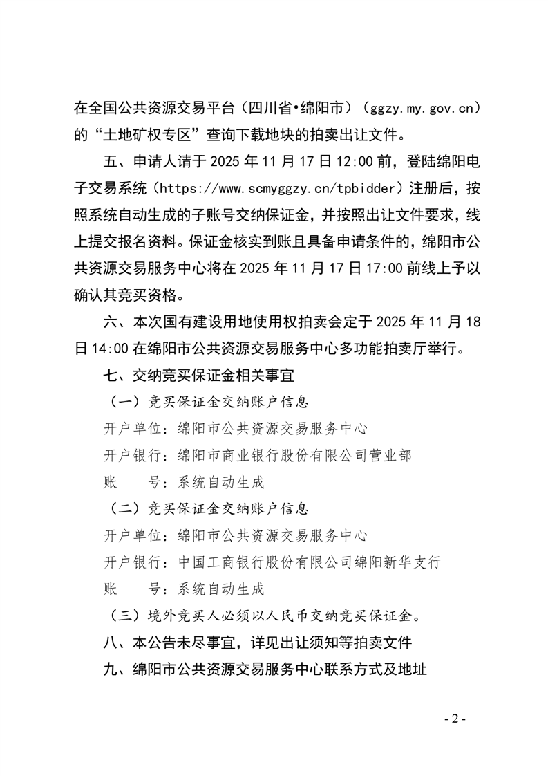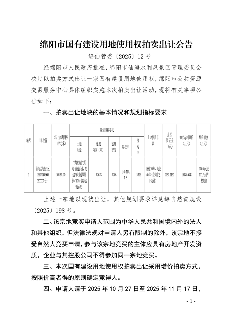 綿陽市國有建設用地使用權拍賣出讓公告(綿仙管委〔2025〕12號)