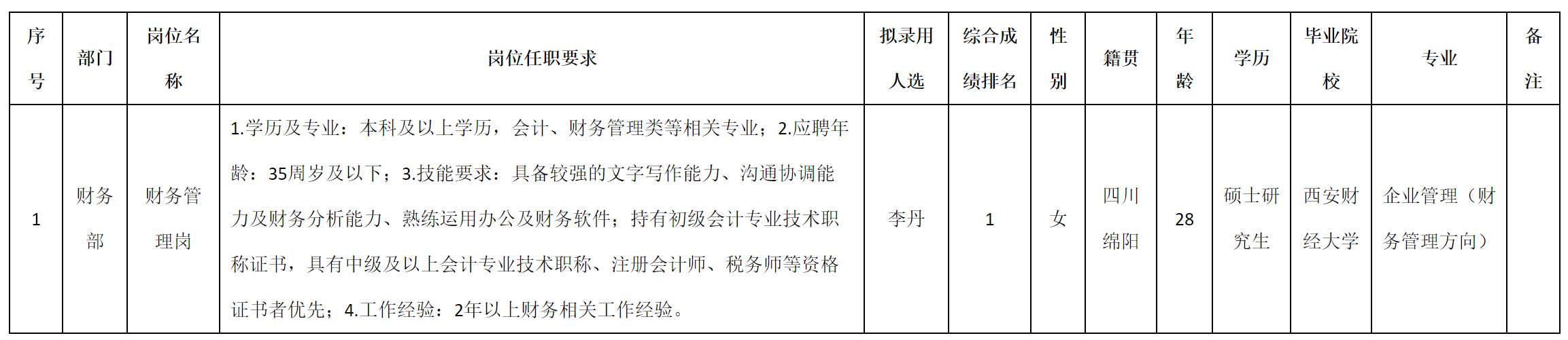 根據四川九洲電器股份有限公司發布的招聘公告及招聘相關規定,經測試、考察、體檢等程序,擬錄用李丹同志到四川九洲電器股份有限公司工作,現予以公示,具體情況如下:
