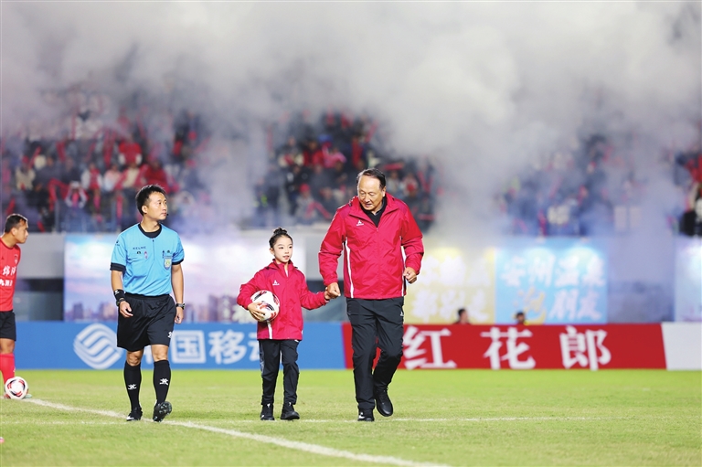 10月25日晚,川超聯賽綿陽九洲長虹隊主場對陣廣元劍門雄關隊。圖為開球嘉賓李日新(右)步入賽場。 記者 陳冬冬 攝