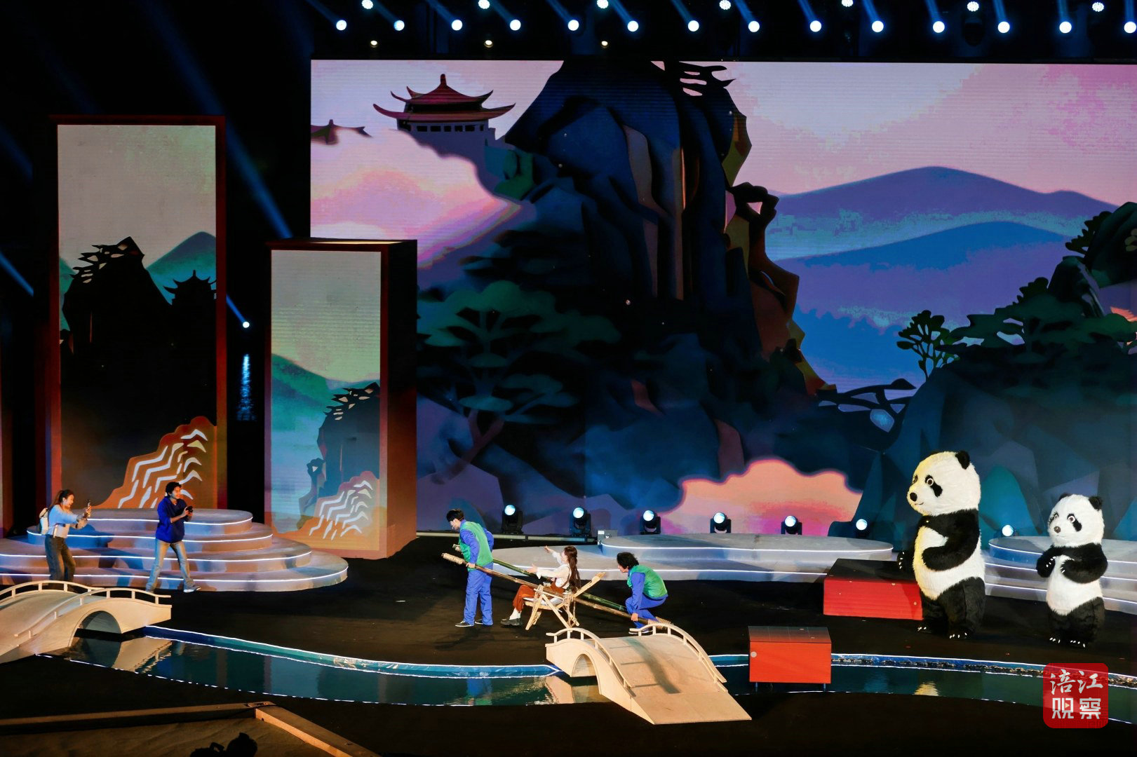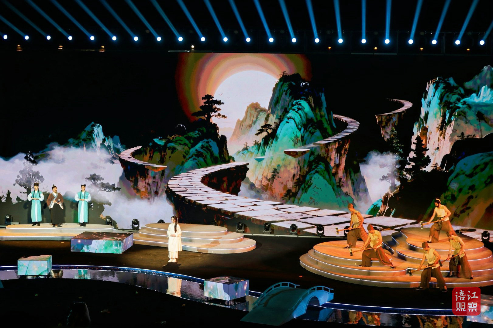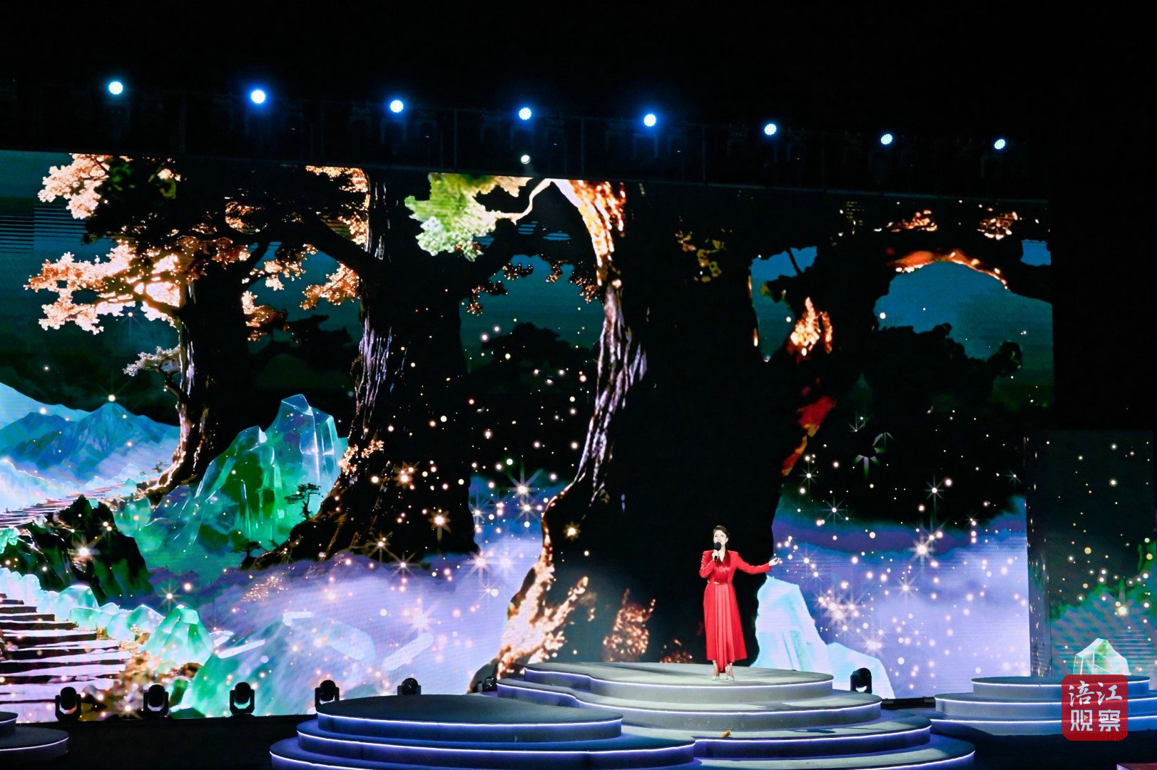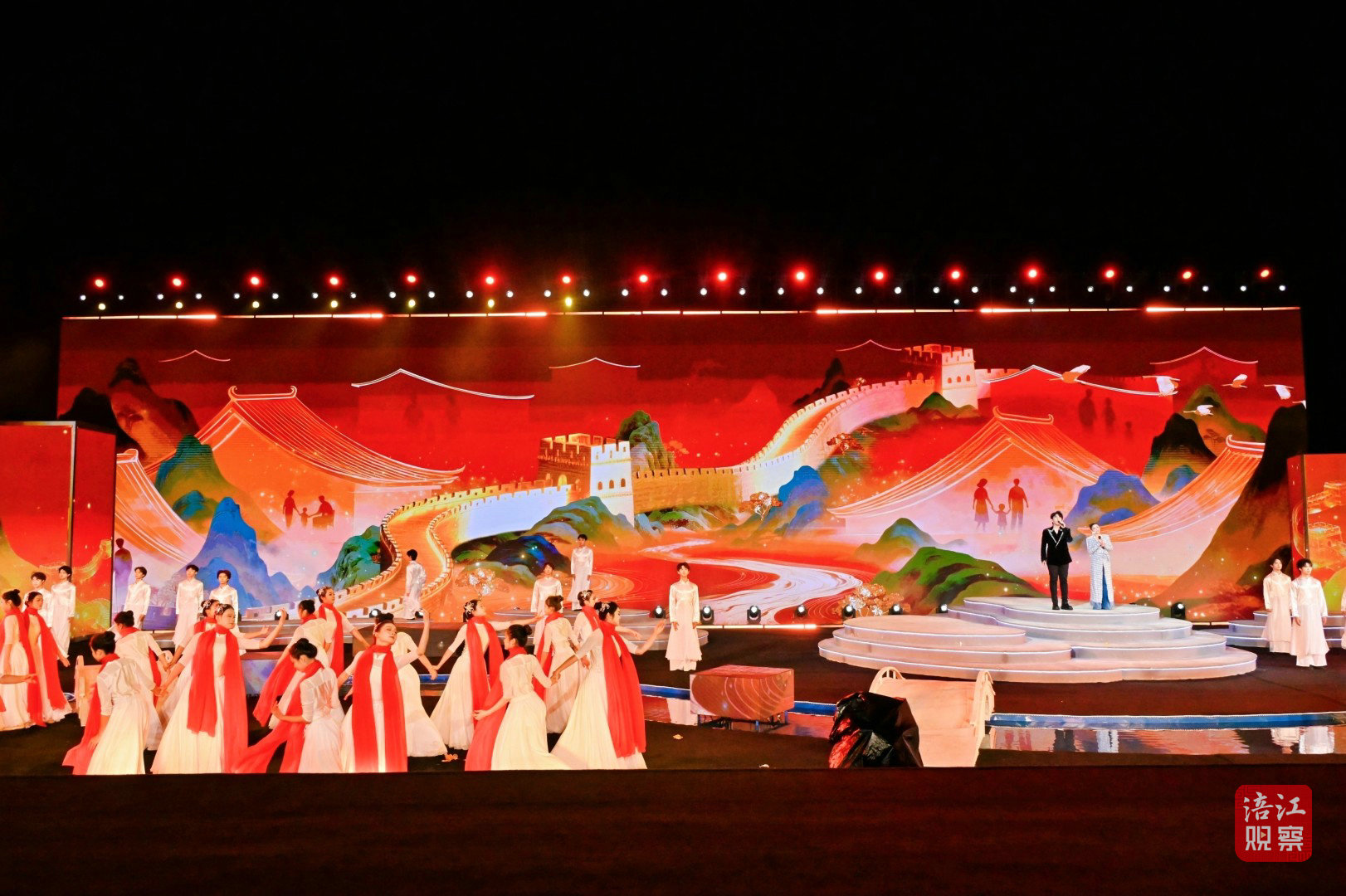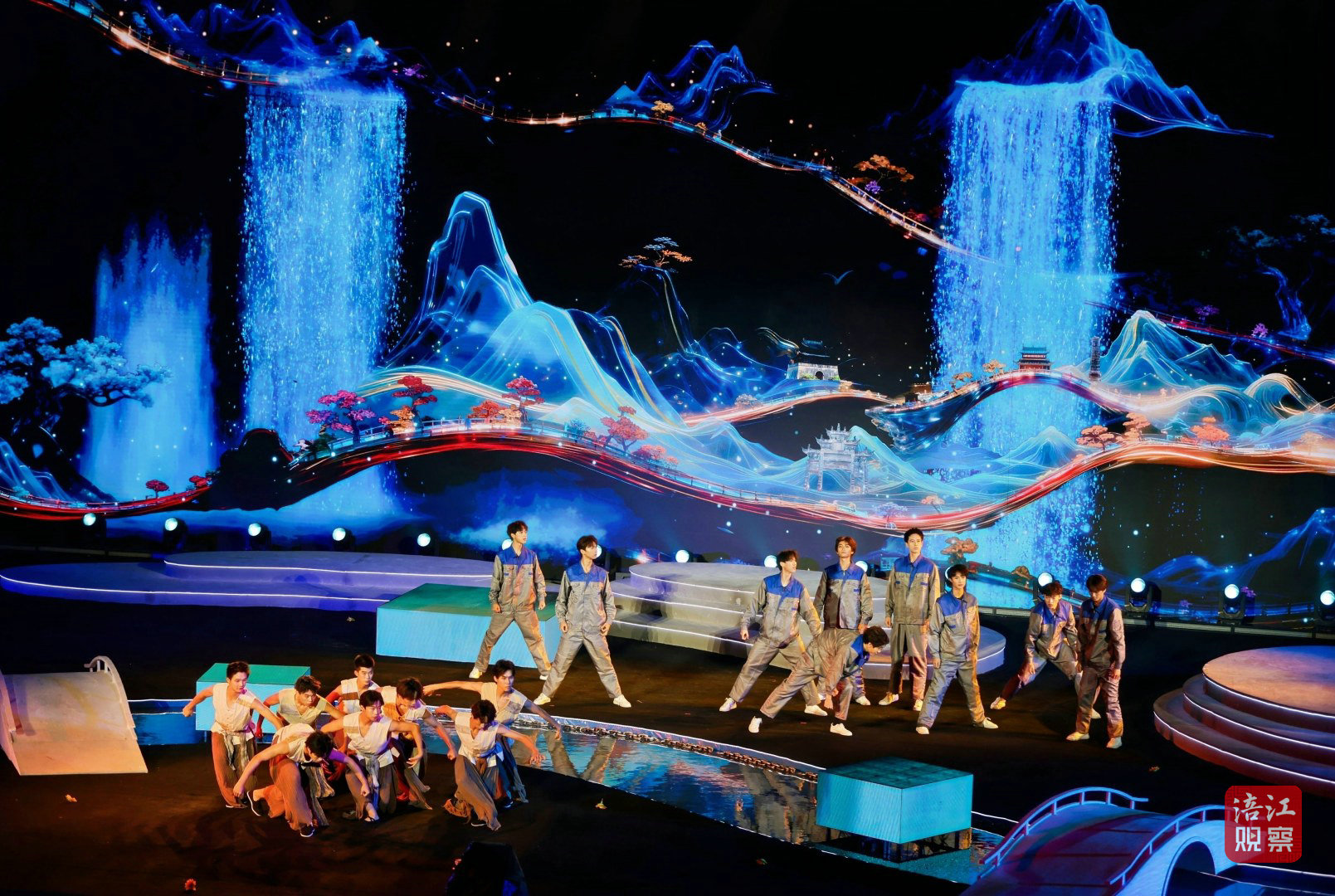此次活動的舞臺設計堪稱一大亮點。超1000平方米的水上舞臺融入了LED屏幕、激光投影、AI、機械裝置、無人機等多種技術手段,為觀眾打造了一場全新的視聽盛宴。