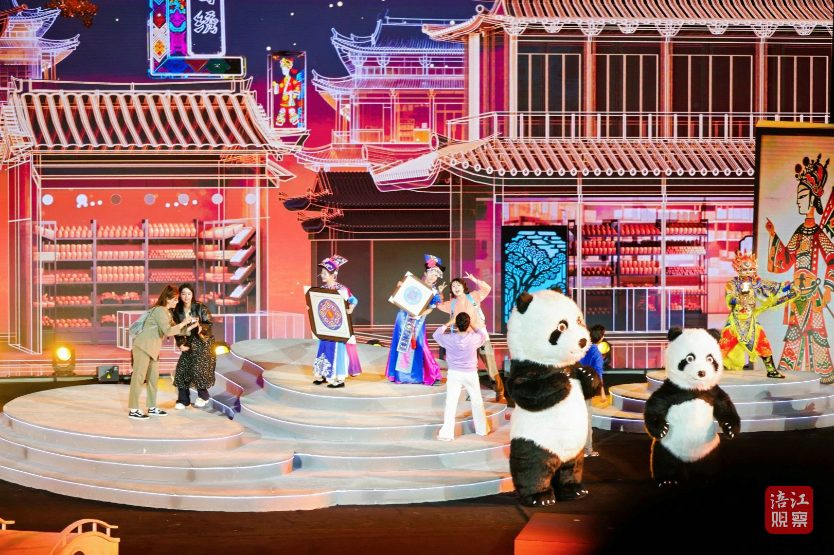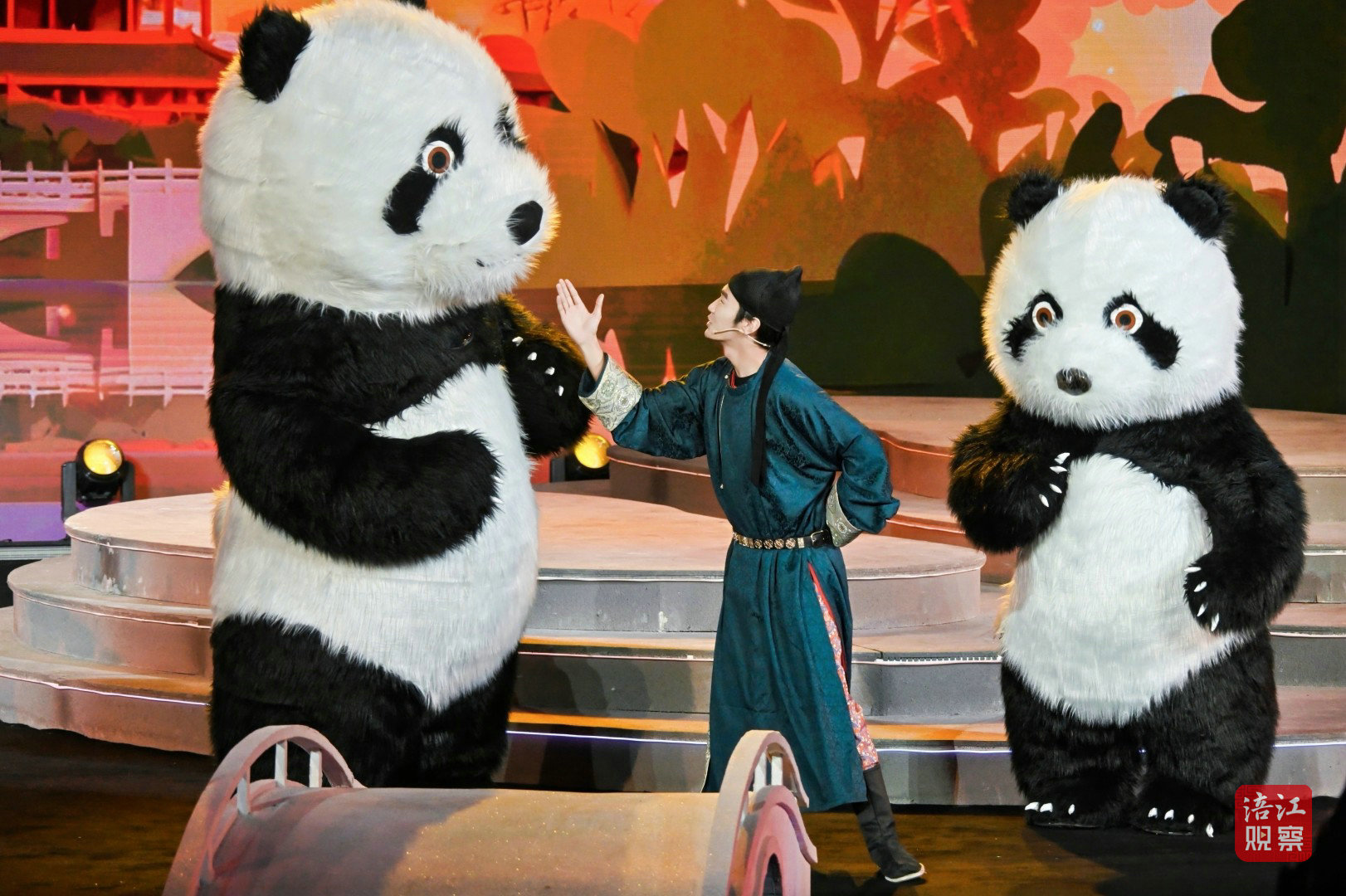 創意舞臺秀《天府十二時辰》以十二時辰為軸,帶領觀眾領略四川十二個旅游目的地的獨特魅力。說書人袁國虎手持折扇,立于三星堆神樹造型的舞臺中央,引領兩只可愛的熊貓“安逸”和“陽陽”開啟時空之旅。