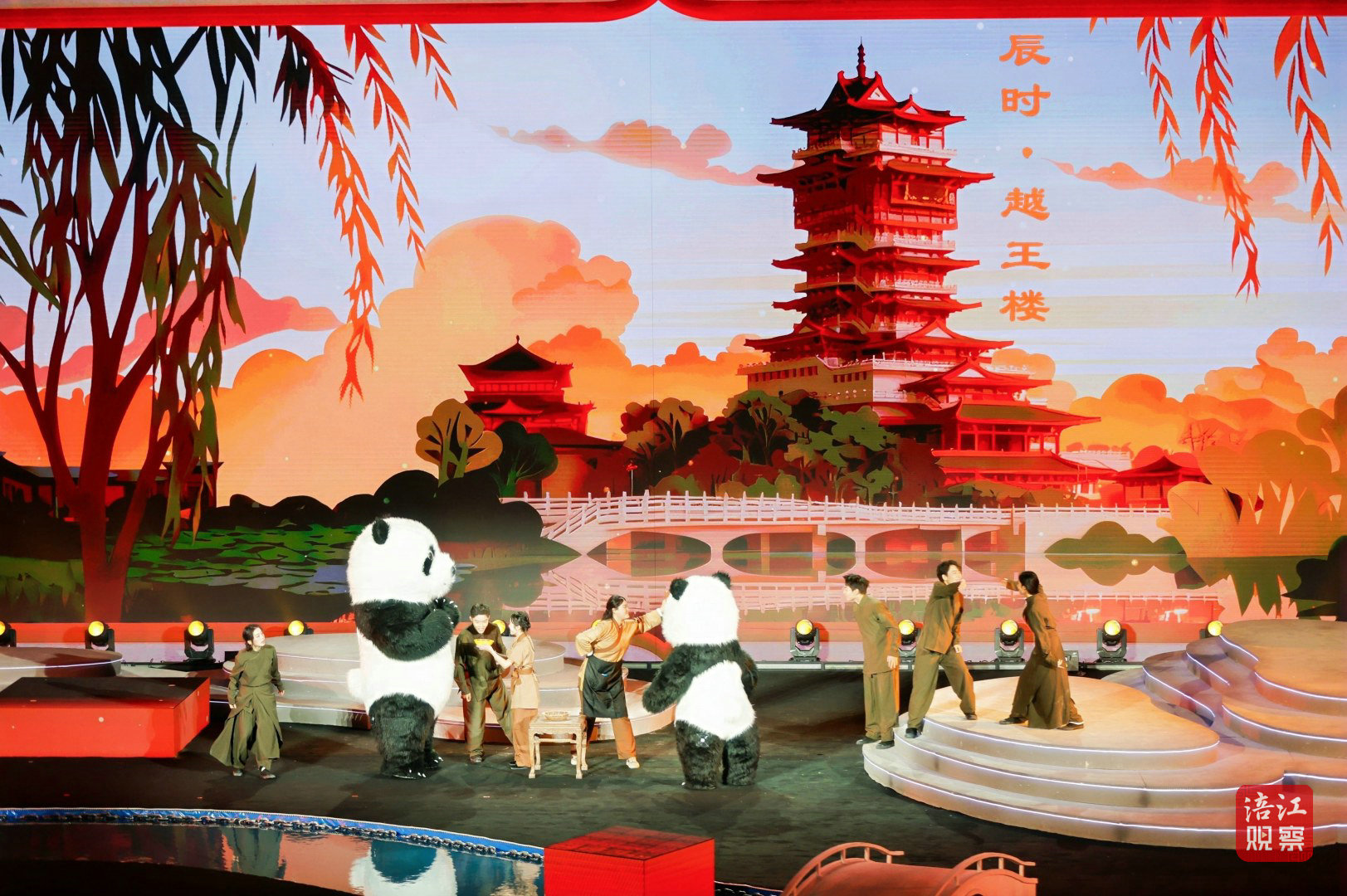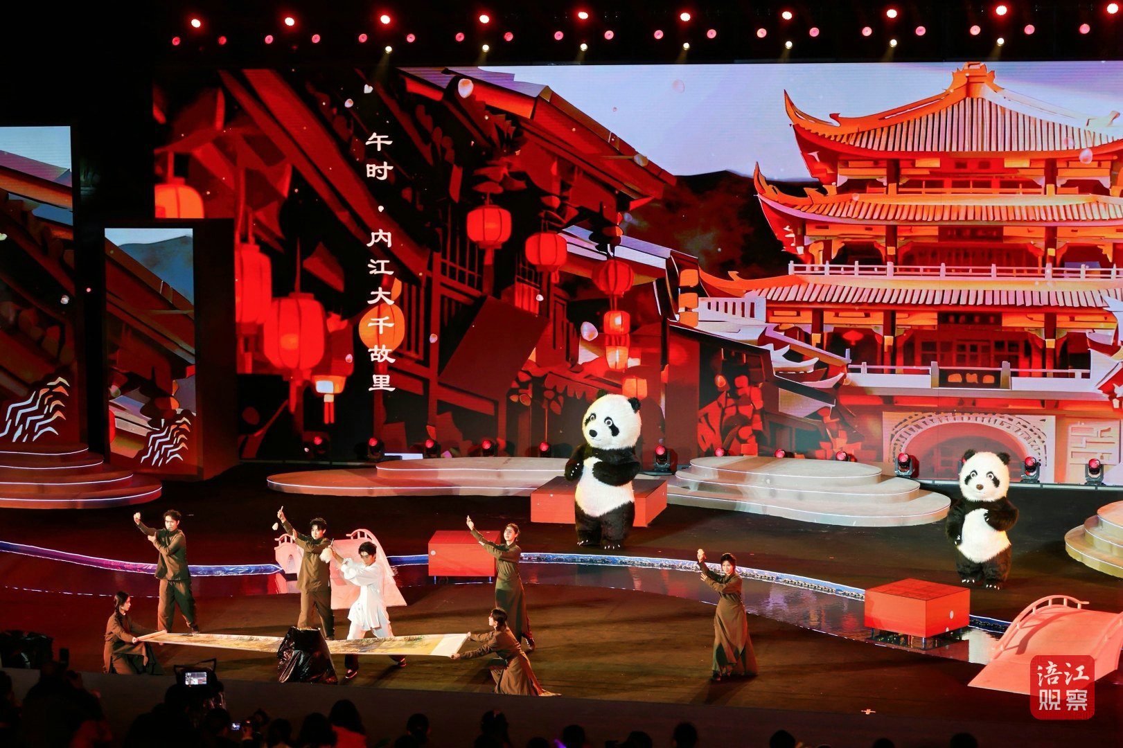 十二時辰走一圈,安逸熊貓、科技熊貓在四川。從辰時綿陽越王樓的巍峨——“辰時登樓望江流,唐代詩篇刻心頭。米粉香飄煙火氣,文武盛景在綿州”,到卯時巴中達州大巴山的秀美——“卯時大巴山雨晴,云霧繚繞似畫屏”,8分鐘的演出讓觀眾沉浸式感受四川的文旅魅力。