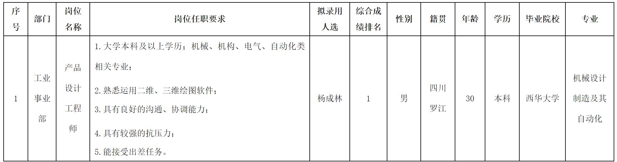 根據四川華豐科技股份有限公司發布的招聘公告及招聘相關規定,經測試等程序,擬錄用楊成林同志到四川華豐科技股份有限公司工作,現予以公示,具體情況如下: