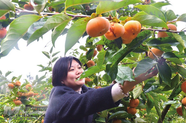 山路旁、山坡上、山坳里……到處都是柿子樹,一顆顆碩大的柿子火紅火紅的,儼然一盞盞精巧的小燈籠。三五成群的游客在柿子園里穿梭,劉先生和趙女士來自成都,他們是從網(wǎng)上得知這里能實(shí)現(xiàn)“柿子自由”,就趁周末結(jié)伴過來采摘、品嘗。