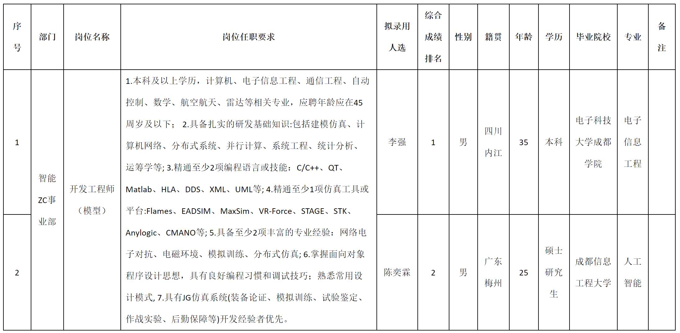 根據四川九洲投資控股集團有限公司軟件與數據智能軍團發布的招聘公告及招聘相關規定,經測試、考察、體檢等程序,擬錄用李強等2名同志到四川九洲投資控股集團有限公司軟件與數據智能軍團工作,現予以公示,具體情況如下: