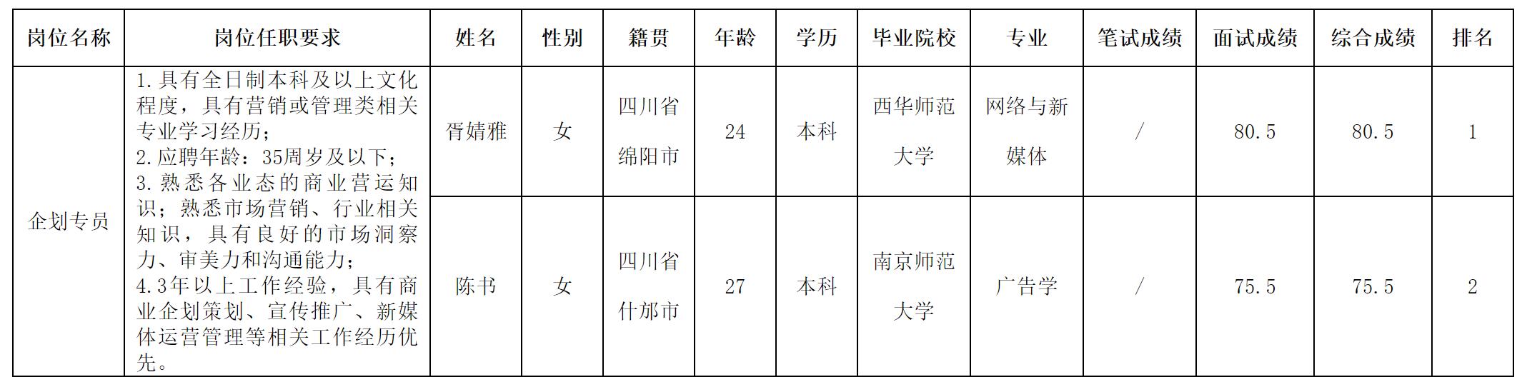 根據四川長虹繽紛時代商業管理有限公司發布的招聘公告及招聘相關規定,現將測試成績予以公示。
