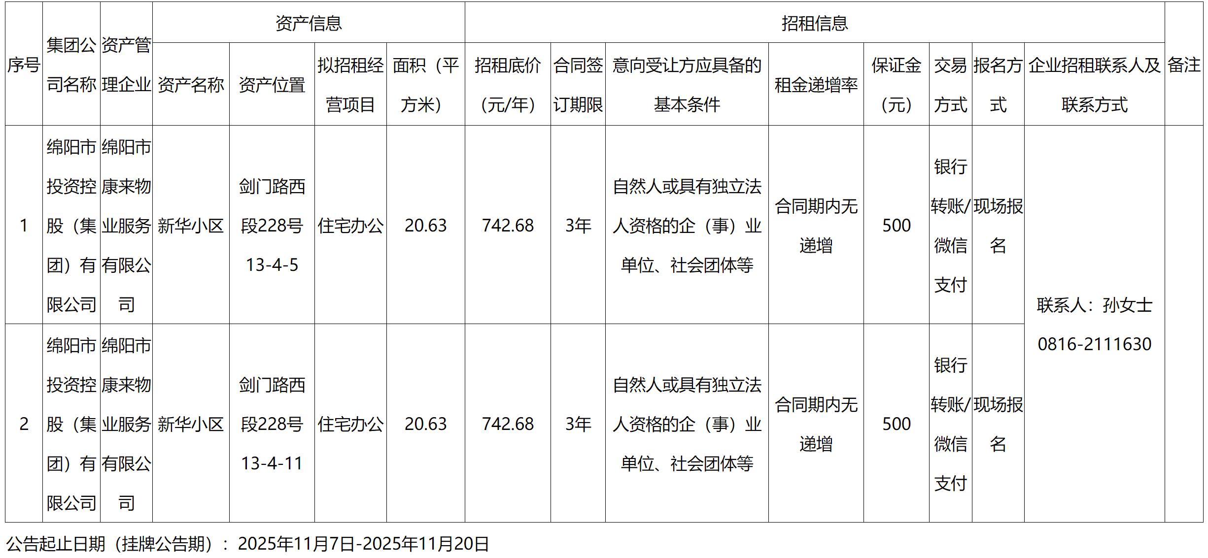 綿陽市康來物業(yè)服務(wù)有限公司資產(chǎn)出租公告