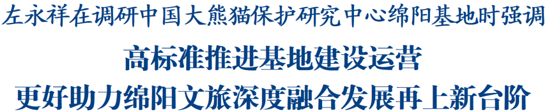 調研過程中,左永祥強調,中國大熊貓保護研究中心綿陽基地肩負著物種保護、科普研學、生態體驗等重要職能,也是綿陽文旅融合的靚麗名片。要以綿陽基地建成運營為契機,講好大熊貓故事、做好大熊貓文章,推動“MyPanda”大熊貓文化IP深度融入“青睞綿陽 熊貓有約”文旅品牌建設,謀劃推出更多具有熊貓元素的新場景新業態新產品,走出一條具有綿陽特色的文旅深度融合發展新路子。要深入挖掘大熊貓文化內涵,結合王朗自然保護區等周邊資源,精心設計科普內容和互動體驗項目,積極融入“大九寨”等文旅品牌建設,強化全方位、多角度、立體化宣傳推廣,吸引更多人來消費、旅游。要強化科研和人才支撐,依托中國大熊貓保護研究中心,深入開展大熊貓和伴生瀕危野生動物保護科學研究,做好大熊貓飼養繁育、疾病防控、野外救護、調查監測等工作,推動更高水平的大熊貓保護,更好助力大熊貓國家公園高質量建設。