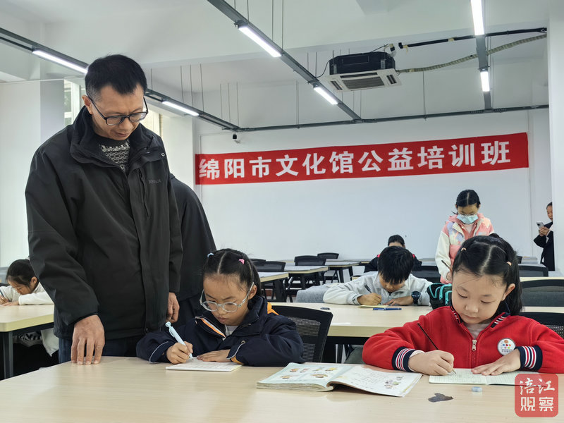 在三樓書法培訓室的書法精進體驗班,綿陽市文化館工作人員曹文龍正在輔導小朋友硬筆書法、毛筆書法,從書寫的手姿、坐姿、筆法技巧等進行示范講解。老師講得仔細,小朋友們練得認真,現場圍觀的家長都拿出手機記錄下了這個畫面。