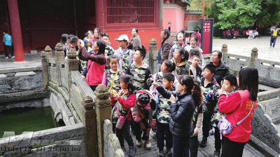 學(xué)生走進(jìn)北川九皇山景區(qū)參觀游覽。