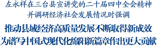 學習好貫徹好黨的二十屆四中全會精神是當前和今后一個時期的重大政治任務。調研中,左永祥深入基層一線向干部群眾宣講全會精神。他說,黨的二十屆四中全會是在我們黨團結帶領全黨全國各族人民以中國式現代化全面推進強國建設、民族復興偉業的關鍵時期召開的一次十分重要的會議,意義重大、影響深遠。各地各部門要精心組織傳達學習,廣泛開展宣傳宣講,做到學思踐悟、知行合一。要對標對表全會部署要求,科學謀劃好“十五五”時期經濟社會發展工作,切實把全會精神轉化為實實在在的成效。期間,左永祥聽取了三臺縣經濟社會發展情況匯報,對各項工作取得的成績給予肯定。他指出,三臺縣是全省丘區農業大縣、百萬人口大縣,歷史文化悠久、產業基礎良好,要立足資源稟賦,強化系統思維,堅持因地制宜,扎實推進以縣城為重要載體的新型城鎮化建設,統籌抓好鄉村全面振興,科學布局建設一批優質均衡的公共服務設施,努力走出縣域經濟高質量發展新路徑。要鞏固農業基礎優勢,加快農業全產業鏈培育發展,高標準建設現代農業園區,大力發展現代種業,做大做強農業品牌,積極培育鄉村新產業新業態,推動農業“接二連三”融合發展。要提升工業發展質效,加快“智改數轉”步伐,發揮龍頭企業鏈主作用,深入開展產業招商、以商招商,精準引進上下游企業,推動特色優勢產業建圈強鏈,筑牢縣域經濟堅實支撐。要做優文旅消費,依托獨特文旅資源,發揮體育賽事活動帶動作用,創新思路推進文商體旅深度融合發展,增加優質供給,激發消費活力,不斷滿足人民日益增長的美好生活需要。當前,要統籌做好抓項目、擴投資、促消費、惠民生、保安全等重點工作,全力沖刺四季度,堅決完成全年目標任務,確保“十四五”圓滿收官、“十五五”良好開局。