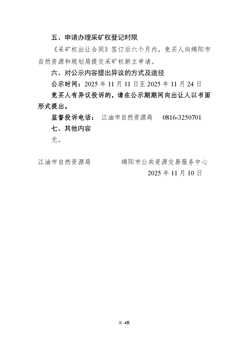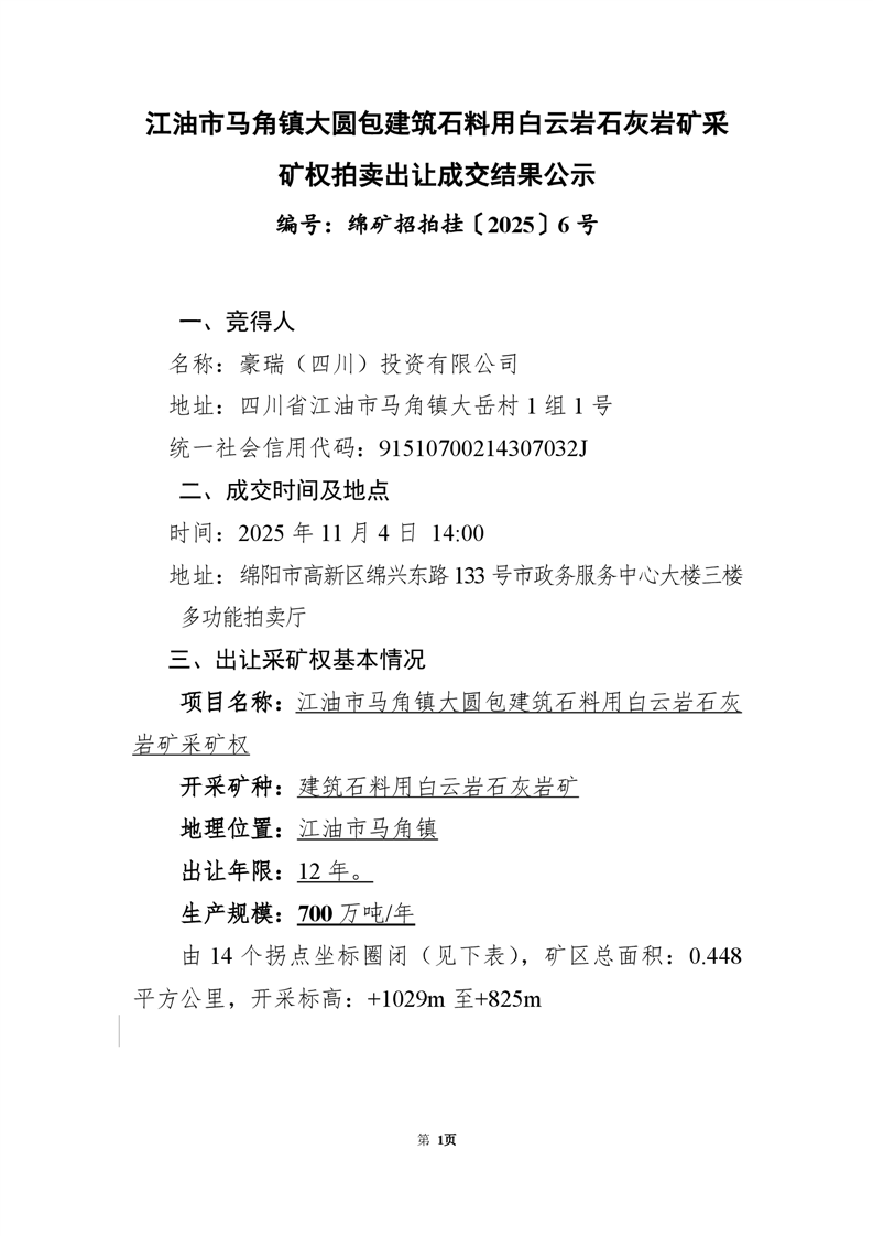 江油市馬角鎮(zhèn)大圓包建筑石料用白云巖石灰?guī)r礦采礦權(quán)拍賣出讓成交結(jié)果公示(綿礦招拍掛〔2025〕6號)