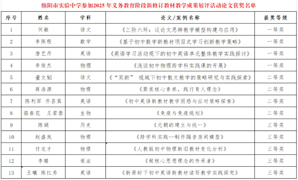 綿陽新聞網訊 11月7日,由綿陽市教育科學研究所精心組織的2025年義務教育階段新修訂教材教學成果展評活動成果揭曉。經過評委專家組公開、公平、公正的嚴格評審,綿陽市實驗中學(綿陽七中)多名教師憑借扎實的專業功底與創新的教學實踐,斬獲多項大獎,成果豐碩。