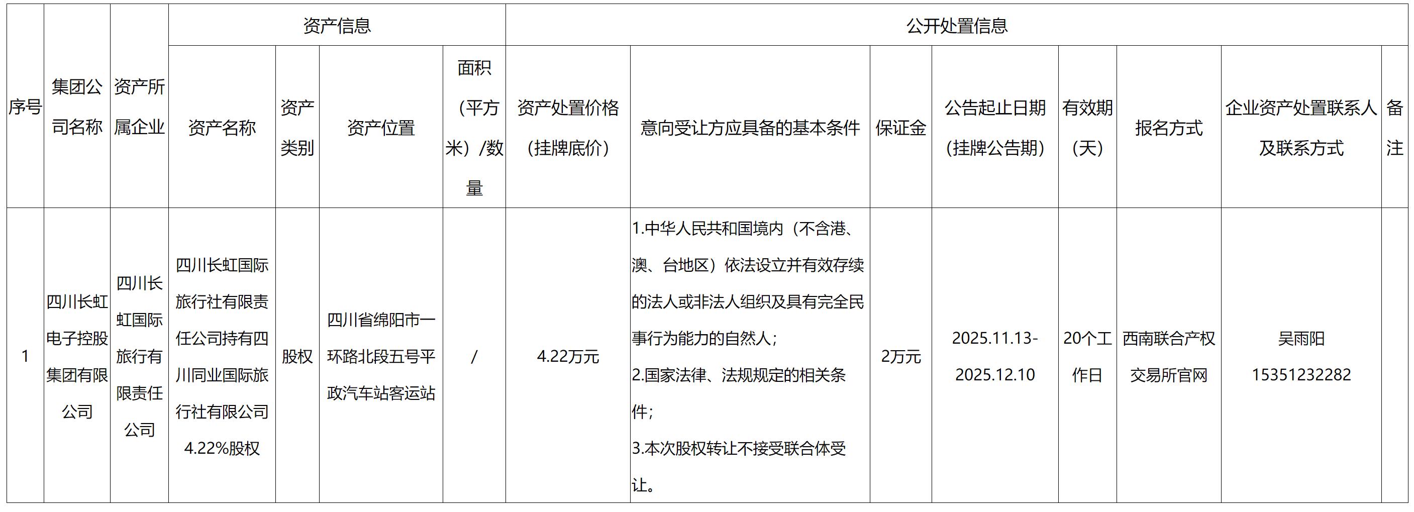 四川長虹國際旅行社有限責任公司所持四川同業(yè)國際旅行社有限公司4.22%股權轉讓公告