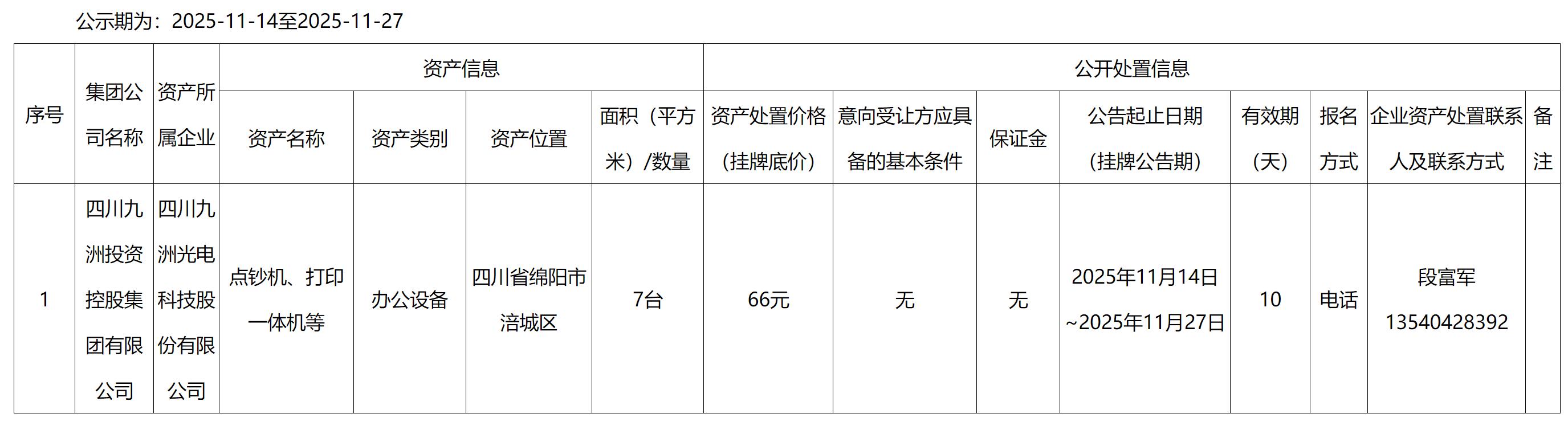四川九洲光電科技股份有限公司點鈔機、打印一體機等辦公設備處置公告
