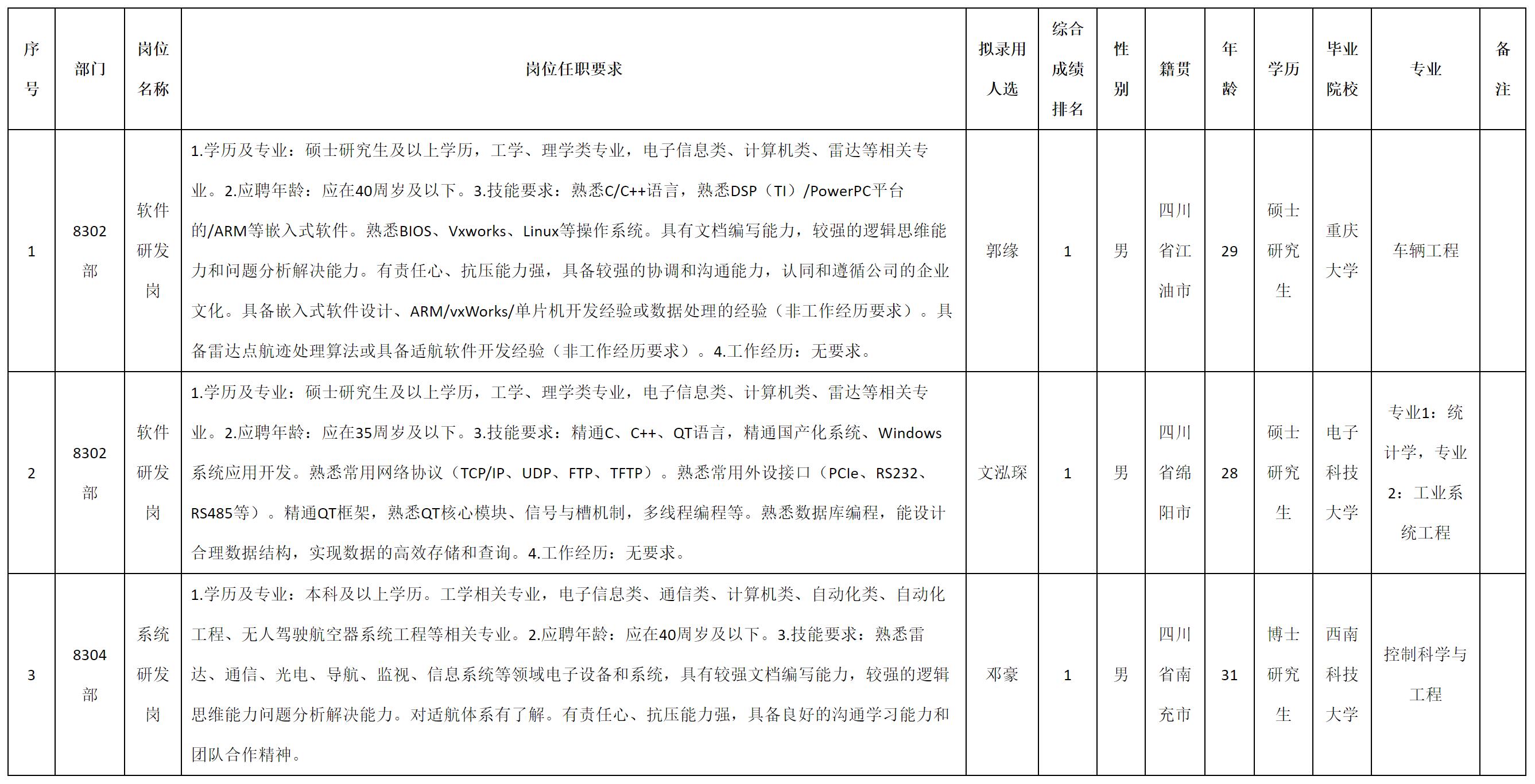根據四川九洲空管科技有限責任公司發布的招聘公告及招聘相關規定,經測試、考察、體檢等程序,擬錄用郭緣等3名同志到四川九洲空管科技有限責任公司工作,現予以公示,具體情況如下: