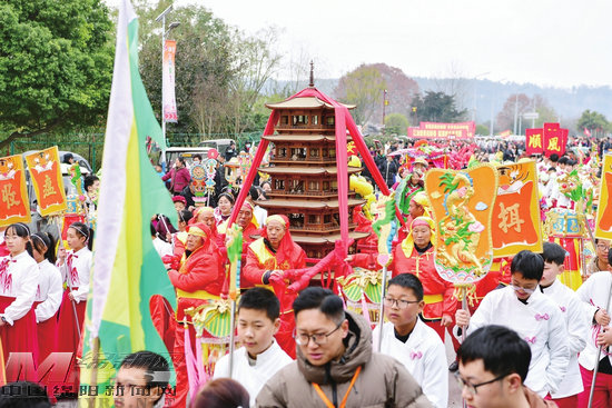 “太白長壽會”的重頭戲當屬“太白架”民俗文化巡游。“太白架”為木雕四方七層塔,高約2.5米,塔身刻有李白、孔子木雕像,個個栩栩如生。上午9時許,隨著司儀官一聲聲高呼,在李白故居隴西院大門前,16人抬起“太白架”緩緩起步,開啟乙巳年太白長壽會民俗文化巡游。青蓮鎮11個村(社區)組織的秧歌、采蓮船等民俗活動表演方陣依次跟上,伴隨著鏗鏘鼓樂,巡游隊伍一路浩浩蕩蕩,并在太白碑林南大門廣場和太白祠進行定點展演。