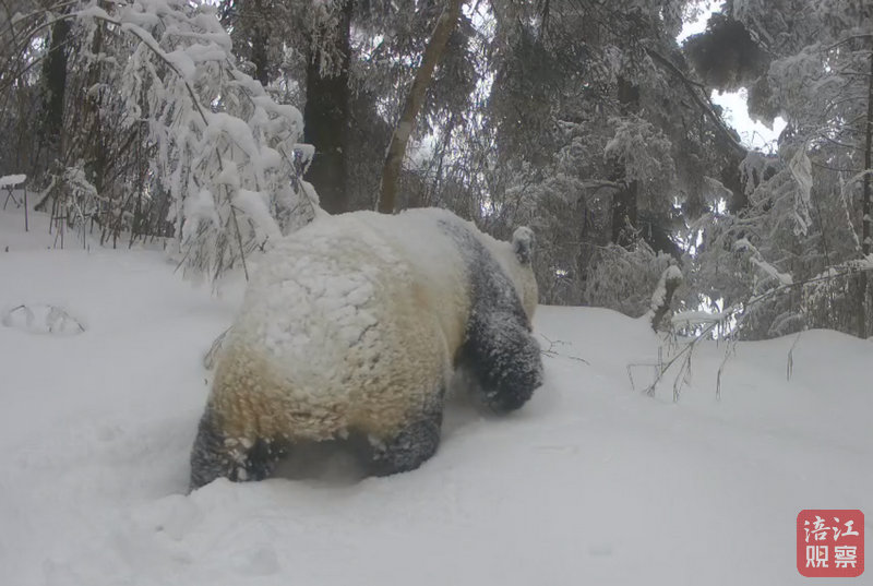 影像資料分別拍攝于2月6日、8日的北川,2月9日的平武。視頻中,厚厚的白雪積壓地面,一只渾身上下裹滿“糖霜”的大熊貓邁著內八步子行走其間,盡管四條小短腿踏入雪堆中就直接被大雪隱去一大半,但依舊影響不了它靈活敏捷的前進步伐。只見它來到一個樹樁前,仔細嗅聞之后,便開始表演它的“打圈兒”式標記絕活。當夜晚來臨,“滾滾”慢悠悠地來到一片竹林中玩耍。它這里瞅瞅,那里嗅嗅,好奇地探頭四處打量,似乎是在尋找什么好玩的東西。