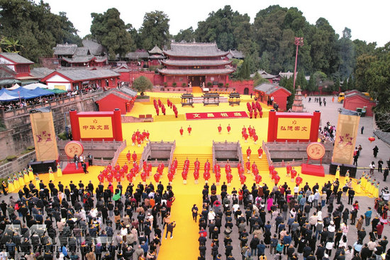 開幕式后,沿襲古老的廟會習俗,三通圣鼓,七曲山大廟正門徐徐開啟,莊嚴隆重的文昌民俗文化活動拉開帷幕。兩岸嘉賓身披綬帶,肅立注目。活動按照傳統(tǒng)“三獻禮”規(guī)制,全程伴歌舞“六佾舞”,長袖明眸,衣袂飄飄。