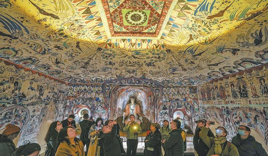 游客在“如是莫高”敦煌藝術大展首季展的復刻石窟中參觀。